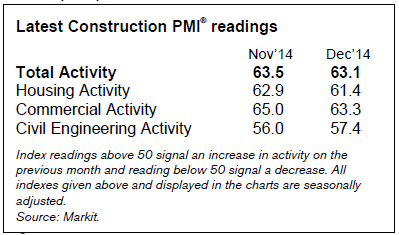 The Irish construction sector maintained its recent run of strong growth in activity at the end of 2014. New orders also continued to expand sharply, albeit at a weaker pace, while companies took on extra staff at a rapid rate. The Ulster Bank Construction Purchasing Managers’ Index® (PMI®) – a seasonally adjusted index designed to track changes in total construction activity – remained well above the 50.0 no-change mark in December, posting 63.1, down slightly from 63.5 in November. This signalled a further strong monthly increase in activity, albeit the slowest in three months. The average reading for 2014 as a whole was the highest since the series began in mid-2000.