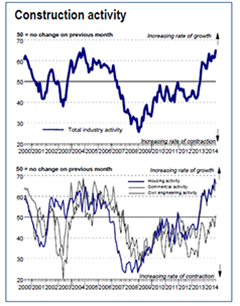 The recovery in the Irish construction sector gathered pace in October, with near-record rises in activity, new orders and employment all seen during the month. Companies remained optimistic that activity will continue to expand over the coming year. On the cost front, a further marked rise in input prices was registered. The Ulster Bank Construction Purchasing Managers’ Index® (PMI®) – a seasonally adjusted index designed to track changes in total construction activity – rose to 64.9 in October from 61.5 in the previous month. The reading was the second-highest since the survey began in June 2000, with November 2004 the only month to have seen a faster expansion. Increased new orders and improving economic conditions had been the main factors leading activity to rise.