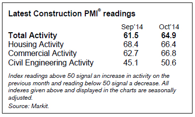 Although construction firms raised their purchasing activity markedly again in October, the pace of expansion eased to the slowest in four months. A further solid increase in input prices was recorded, although the rate of inflation eased slightly for the second successive month and was the weakest since June.
